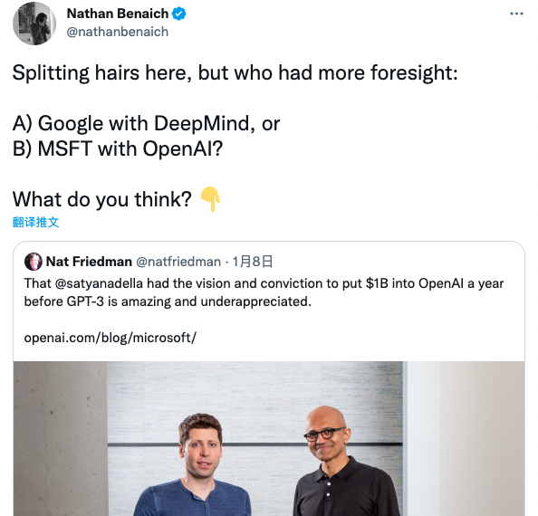 两天前,Nat Friedman 在 Twitter 上称赞了谷歌 CEO Satya Nadella 的创业精神,在 GPT-3 名声赫赫以后便齐基地以 10 万美元资金投入到 OpenAI 中,并附有了彼时 OpenAI CEO Sam Altman 和 Nadella 的合照。只好,许多人紧紧围绕着「谷歌 + OpenAI vs Google + DeepMind」到底孰胜孰败展开了众多的探讨。