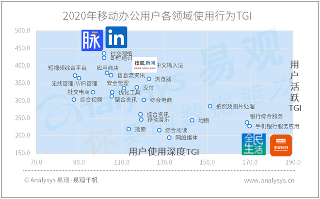 从用户使用行为来看,在线办公群体社交行为活跃,短视频、信息流资讯应用渗透率高;在使用深度方面,移动办公用户在,银行综合服务类和手机银行服务类应用的使用深度较高。