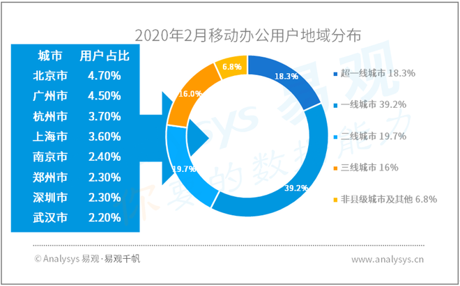 从地域分布来看,移动办公用户主要集中在超一线和一线城市,北京、广州、杭州三地的用户规模分列前三。