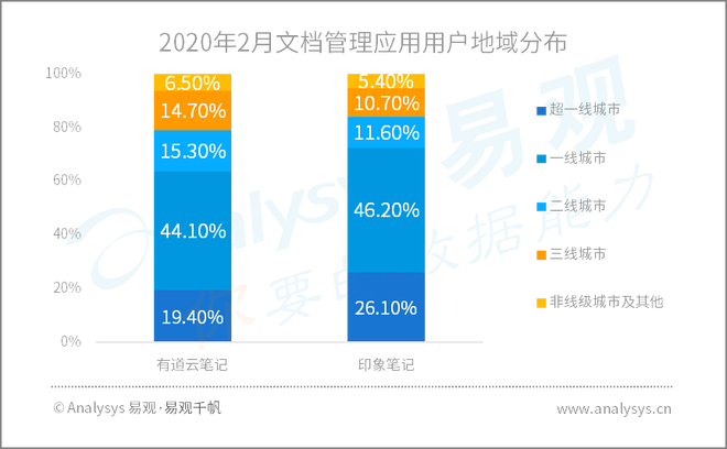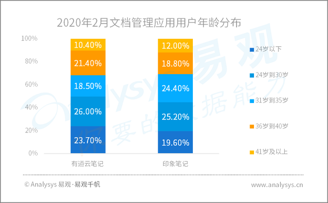 从用户结构来看,与印象笔记相比,有道云笔记的用户群体分布较广,在二线以下城市也有较高的渗透率。从用户年龄来看,有道云笔记30岁以下的年轻用户比重更高。