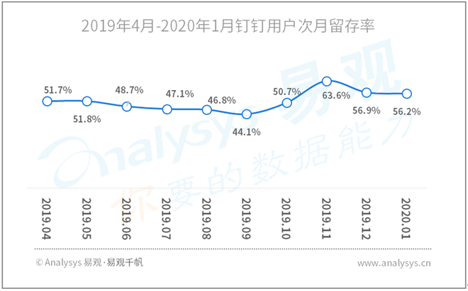 2019年4月-2020年1月钉钉用户次月留存率