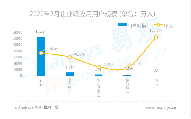 疫情期间,企业协同办公应用爆发式增长,钉钉、企业微信月活用户规模环比分别增长65%、46%。几款软件中,阿里钉钉侧重内部的管理和沟通,解决企业后端需求,对于组织内员工的统一管理,以及企业内部员工之间的沟通有较好的支持。企业微信则侧重外部的沟通及企业形象展示,解决企业前端的需求,例如企业和用户之间可以更好地借助于企业微信平台,进行业务上的沟通和往来合作,在展示企业的对外形象方面更有优势。飞书更侧重于企业组织和个人的办公协作,它深度整合使用率极高的办公工具,并在一个“平台”上,让企业成员实现高效沟通和协作。