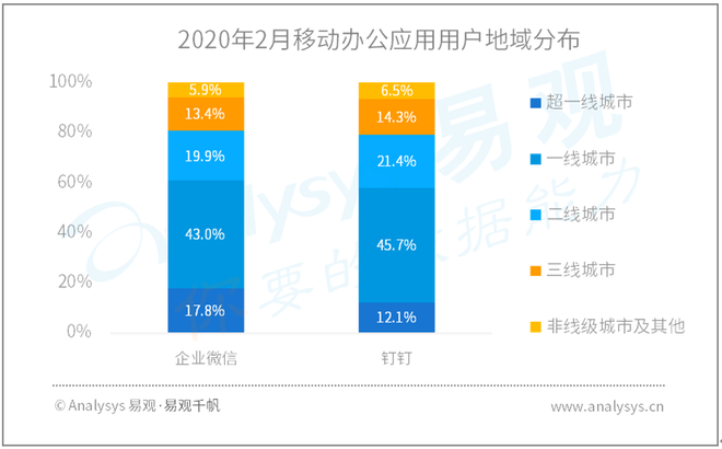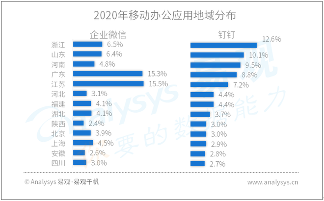 从城市分布来看,企业微信用户在广东和江苏渗透率较高,而钉钉用户在浙江和山东的用户渗透率高。