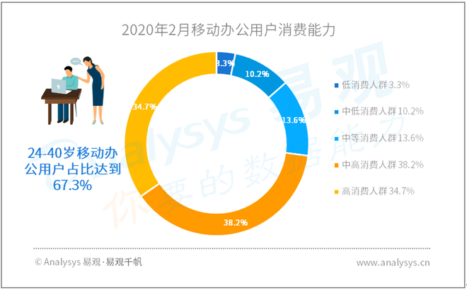从移动办公用户结构来看,24-40岁为移动办公核心用户群体,占比达到67.3%;并且移动办公用户,高消费群体比重达到34.7%。