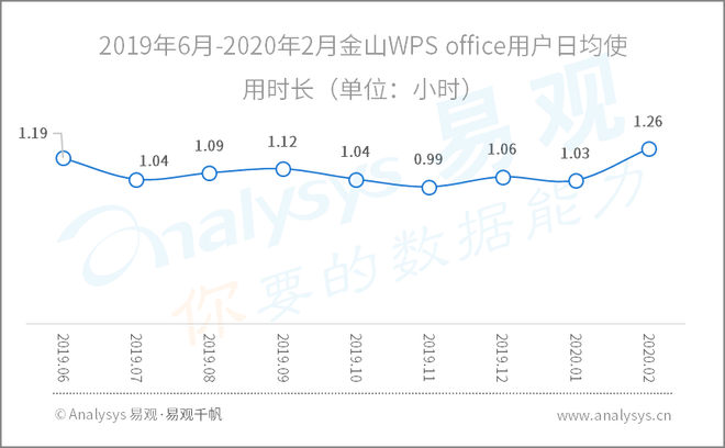 2019年6月-2020年2月金山WPS office用户日均使用时长