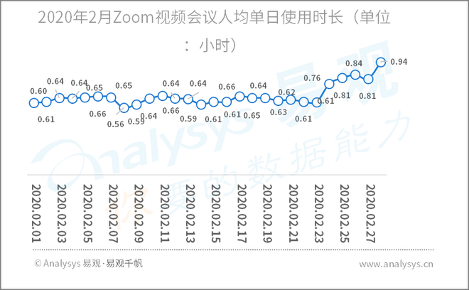 2020年2月Zoom视频会议人均单日使用时长