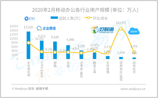 从移动办公各细分行业来看,企业级应用用户规模达到1.35亿人,环比增长76%,视频会议/监控用户规模达到1054万人,环比增长182.6%,远程、异地、多人协作相关的功能需求迅速增长,用户开始探索和尝试很多线上办公的方案,广泛的用户认知和体验习惯会促进未来市场的发展。