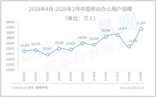 2019年4月-2020年2月中国移动办公用户使用时长