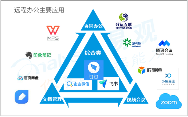协同办公:金山办公旗下WPS Office是文档编辑和云协同产品,但同时也支持演示文稿的云讲解以及视频电话会议。阿里巴巴钉钉、腾讯企业微信、字节跳动飞书,均可以实现文档协同、文字和音视频即时沟通、协同管理办公需求。远程办公大类下各细分领域产品功能界限趋于模糊。