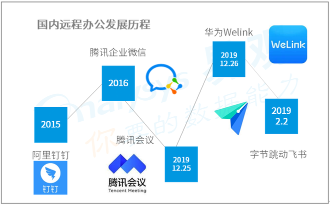 国内远程办公行业紧跟国外步伐,但普及率仍然较低。2015年1月,阿里巴巴率先上线了钉钉,致力于打造领先的智能移动办公平台。在2016年6月,腾讯也推出了为企业服务的腾讯企业微信,开始了对企业协同市场的发展。2019年12月25日,腾讯宣布推出腾讯会议,集合了云视频会议产品。2019年12月26日,华为发布智能工作平台WeLink。华为云WeLink提供基础服务和增值服务两种类型,具备智能高效、安全可靠、开放共赢三大核心优势。2020年2月2日字节跳动宣布开启飞书线上办公模式,帮助国内企业解决在疫情期间的远程办公问题。
