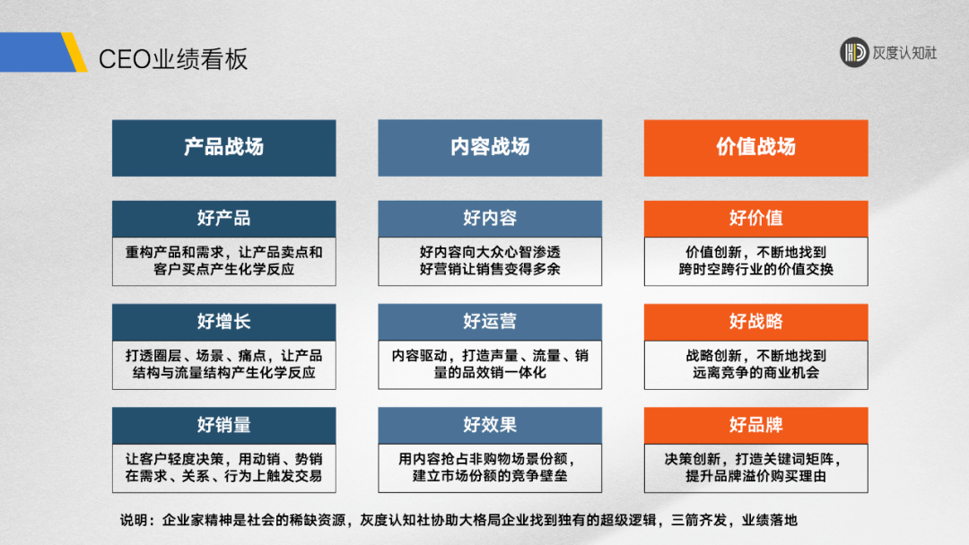 大格局CEO会关注商品主力部队、文本主力部队和商业价值主力部队。其中:商品主力部队,会关注好商品、好快速增长、好产品销售量四个关键成功要素。