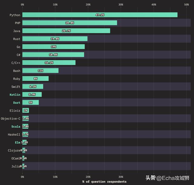 除了前端语言,用户使用过的其他语言中,使用最多的就是 Python,有超过 40% 的用户使用Python: