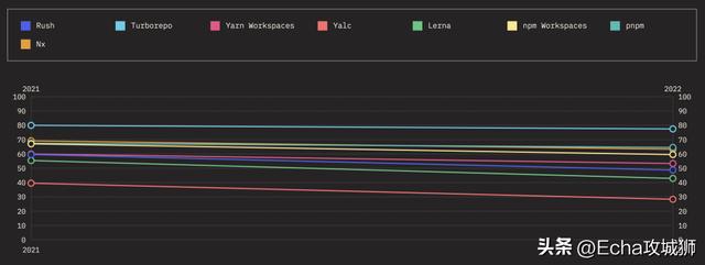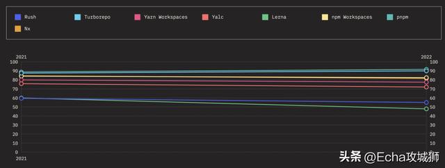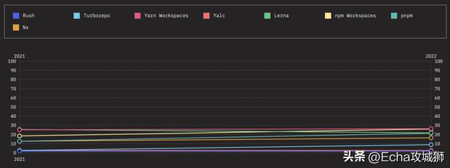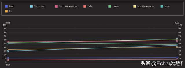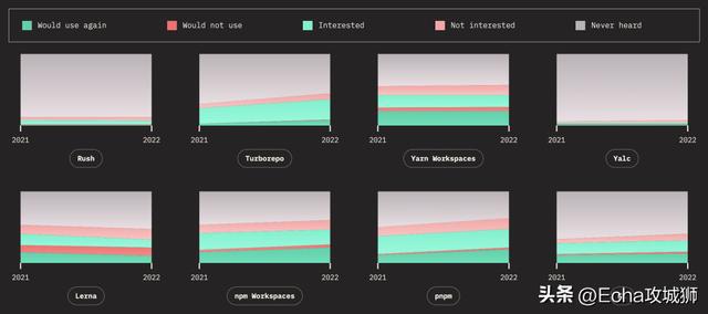 下面来看看随着时间的推移,热门 Monorepos 工具的保留率、兴趣率、使用率和认知率。