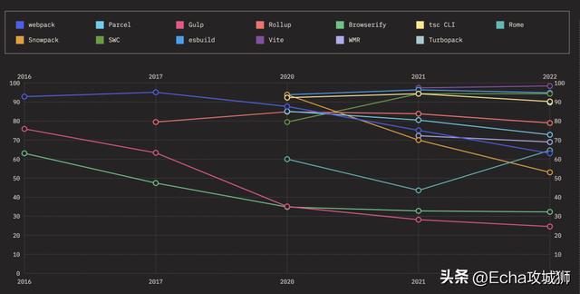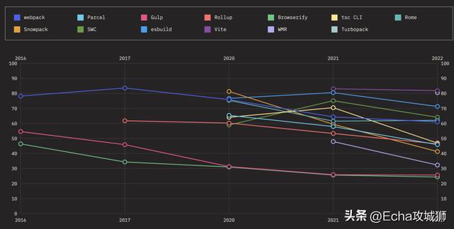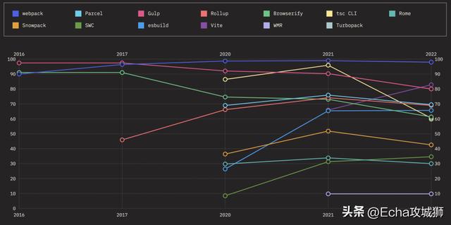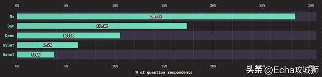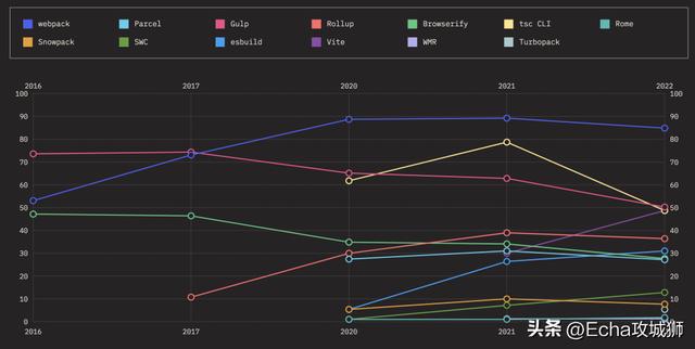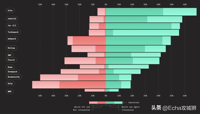 使用率如下,虽然webpack的保留率在逐年下降,但仍是使用率最多的构建工具。Vite 的使用率较去年有很大的提升,未来发展空间很大: