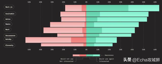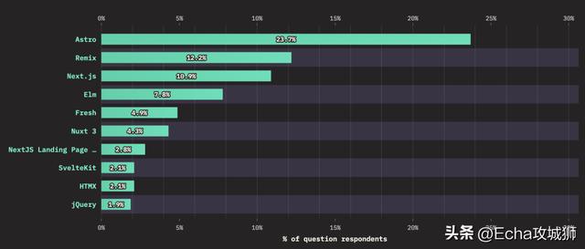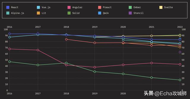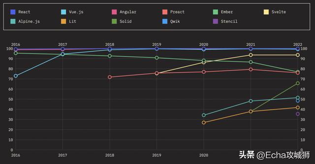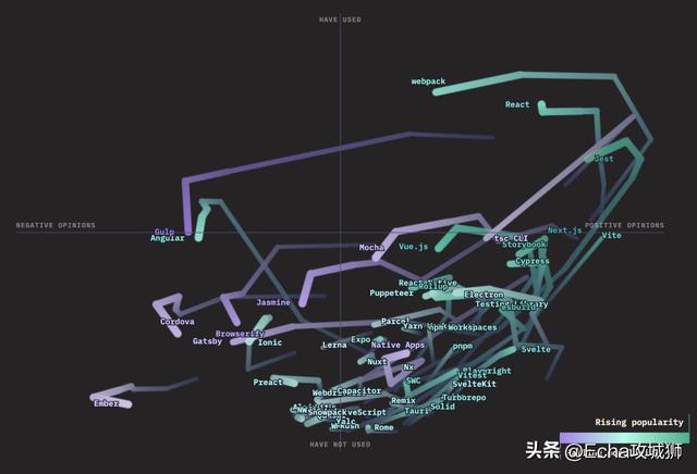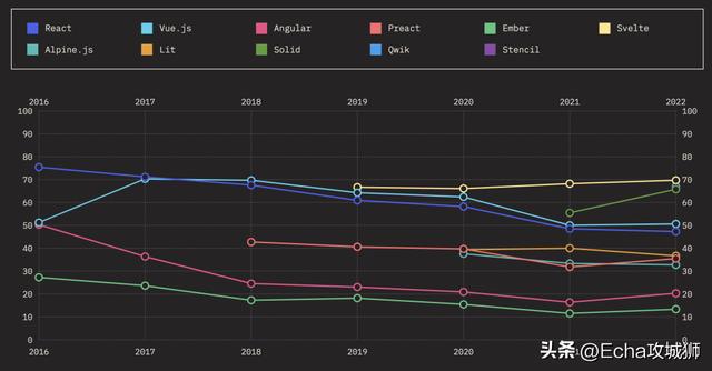 当我们查看React、Angular或Vue等已建立的框架时,我们经常会看到满意度下降,人们可能会想知道这对未来意味着什么。我认为,这种下降是工具经过实战测试并在生产中使用的一种功能,是找到粗糙的边缘并体验每种工具所具有的权衡。这是一个成熟的标志,也是对这些工具所能提供的清晰的欣赏。他们还将从太空中的创新中学习并继续发展。