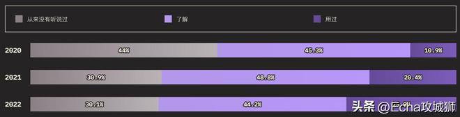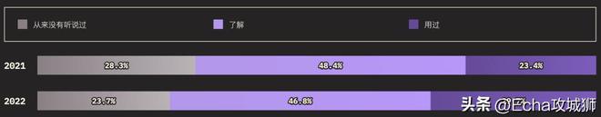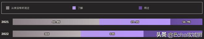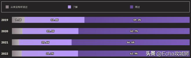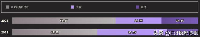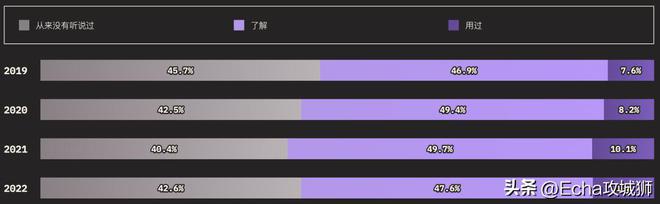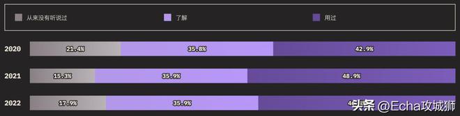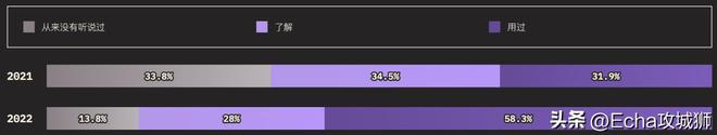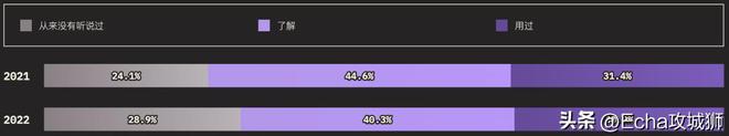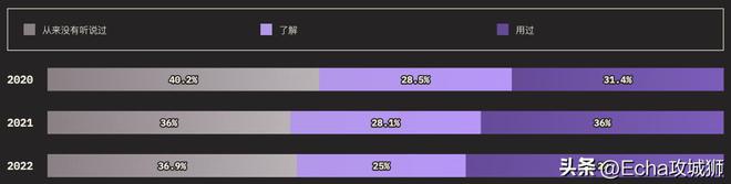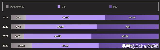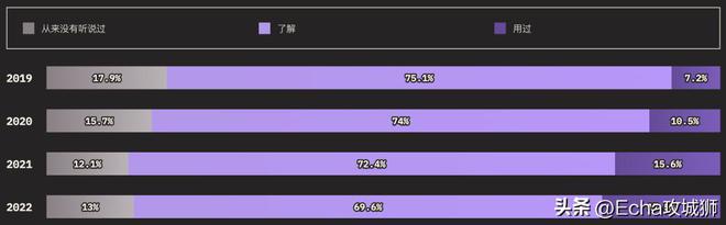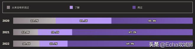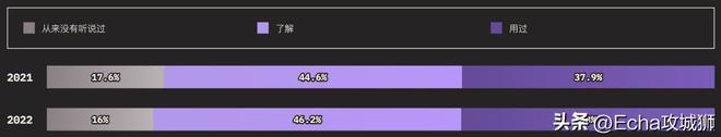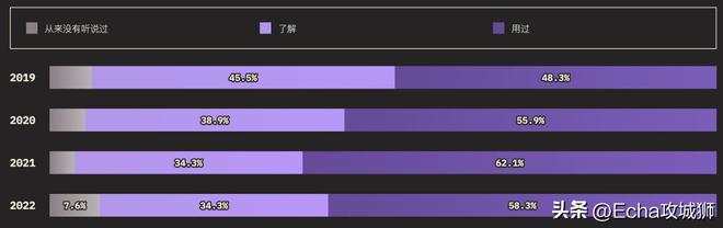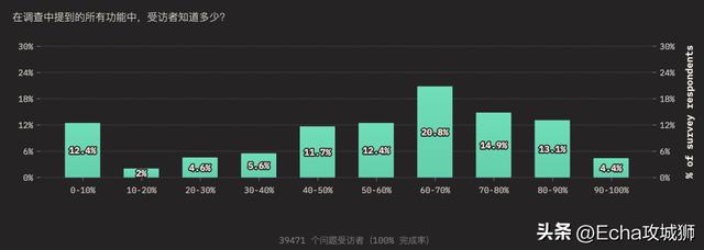 外圈的大小对应的是知道某个功能的用户总数(知道+用过的受访者),而内圈代表实际使用过的用户(用过的受访者)。在调查提到的所有功能中,受访者的了解程度如下: