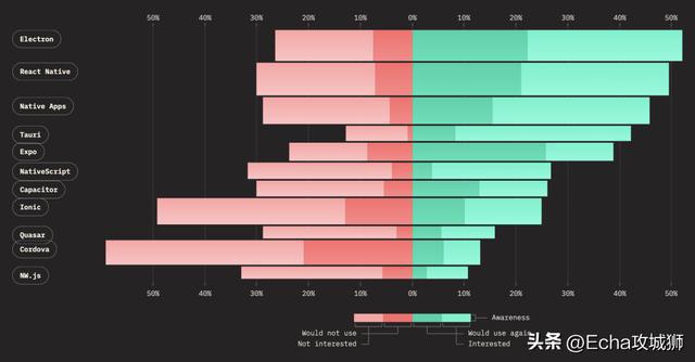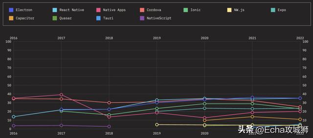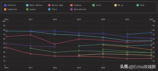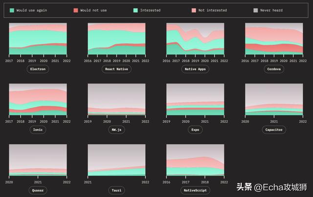 下面来看看随着时间的推移,热门移动端&桌面端框架/库的保留率、兴趣率、使用率和认知率。