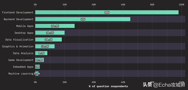 下面是用户使用 JavaScript 的用途,98%的受访者使用JavaScript编写前端应用,还有65%的受访者使用JavaScript编写后端应用。