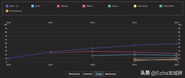 下面来看看随着时间的推移,热门渲染框架的保留率、兴趣率、使用率和认知率。