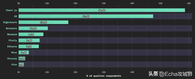 常用的数据可视化库中,使用最多的就是 Chart.js 和 D3,分别占比 58.6% 和 47.4%。