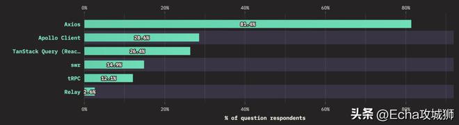 常用的中,Axios 遥遥领先于其他库,超过80%的用户使用 Axios。