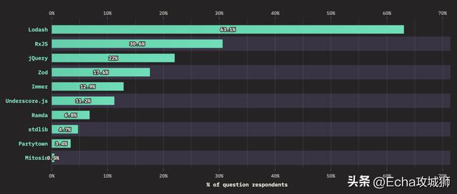 受访者经常使用的库中,最受欢迎的就是 Lodash,超过 63% 的用户使用过 Lodash: