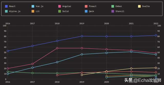 使用率如下,近四年前端框架的使用率趋于稳定,其中 React 一直处于领先地位: