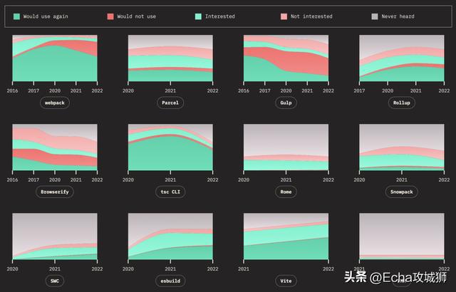 下面来看看随着时间的推移,热门构建工具的保留率、兴趣率、使用率和认知率。