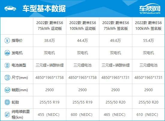 2022款蔚来ES6提供两种动力,共计四种不同续航里程车款版本可供顾客优先选择。双电机驱动系统能够带来极为强悍的动力模块,低功率版本最大功率320kW,最大扭矩610N·m,而高功率版最大功率可达400kW,最大扭矩725N·m,官方公布的百公里加速时间分别为5.6s和4.7s。续航里程方面,根据便携性不同,电池类型及容量也有所区别,最大续航里程分别为455km、465km、600km和610km。