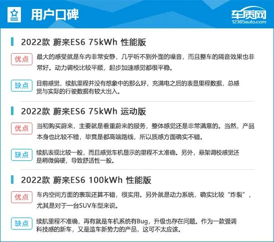 在车质网“蔚来ES6”车系频道中,共有22人参与评分活动,其中20人给出四星赞扬,另有2人给出了三星赞扬。在评论中,有车友总结出2022款蔚来ES6在采用过程中的优点及不足,可以为其它顾客提供更为真实全面的参考意见。