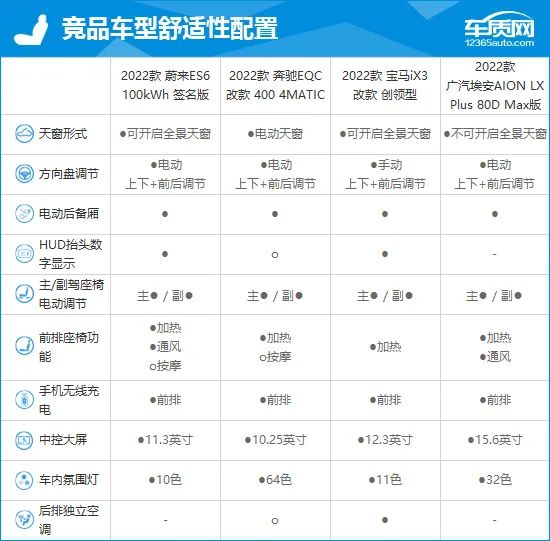 目前市面上的纯电动小型SUV优先选择并不算太多,除了奔驰EQC和宝马iX3这两个传统豪华国际品牌车款之外,在自主国际品牌中,除了蔚来ES6,数得上的也就是广汽埃安AION LX。对照来看,四款车款在便携性环节的总体表现都差强人意,毕竟已经达到了这个级别,因此谁都不存有明显硬伤。