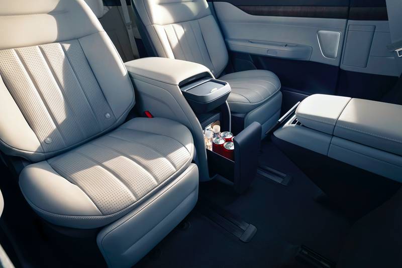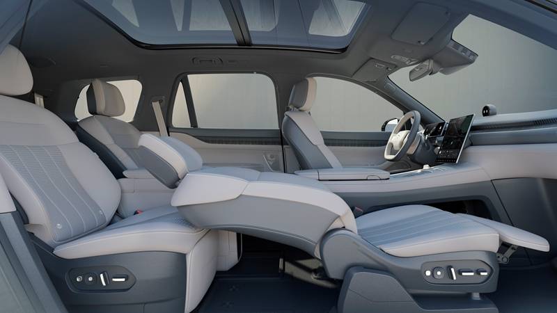 内装上新车款采⽤⼤⾯积⽪质包覆,配合柔光⾦装饰件、可再⽣藤⽊等材质的应⽤,提高了车内的质感。另外,ES8崭新升级了女王副驾,可通过一键舒享模式实现零重力姿态。ES8第二排独立坐椅宽度达到550公厘,并配有了电动车腿托,支持 135°角度控制。第二排中央扶手之间通过数字层+储物层的结合,打造崭新的“行政中岛”布局。当中,数字层提供更多蔚来手机车机互联及手机无线充电、杯托、置物等功能;储物层可选车载冰箱。第三排坐椅选用环抱式结构设计,配有坐椅加热和电动车角度控制功能,并且提供更多杯托和Type-C充电接口,配合三排五区独立空调及新风系统,提高了使用者的驾乘舒适度。同时,蔚来的EC7车款上也配有了该高端坐椅平台。