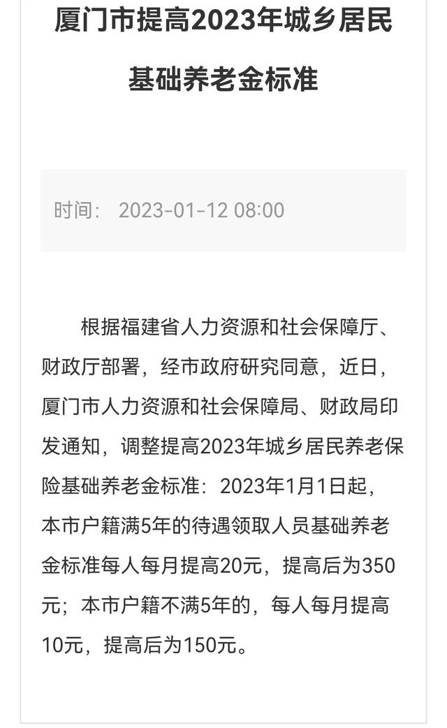 再比如说漳州厦门,也从2023年1月1日起下调农村居民此基础养老基金,本市户籍满5年的此基础养老基金涨到350元,涨了20元;本市户籍不满5年的,涨到150元,涨了10元。