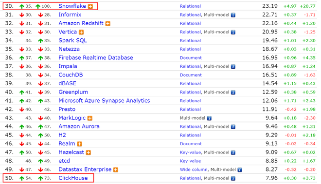 竭尽全力往下看一看名列 20 后的资料库,二十一岁为层次,名列明显上升的资料库有 Snowflake 和 Clickhouse,Snowflake 由今年同末期的第 100 名上升到那时的第 30 名,前者也从第 75 名上升至第 50 名。二者都归属于云基础架构,Snowflake 的控股公司今年挂牌上市后着实赢得芒格青睐,股价飙升。坚信这也是它名列上升的主要原因。