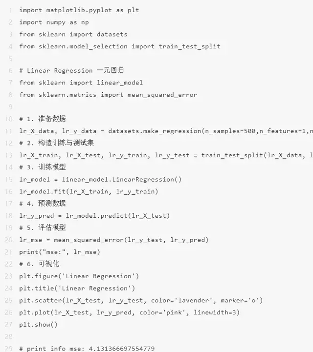 它为表达式分配最佳权重,以创建一条直线或两个平面或更高维的超平面,使得预估值和真实值之间的误差最小化。具体基本原理参考:用人话讲明白线性重回LinearRegression – 化简可得的文章 – 知乎。下面以一元线性重回为例,给出代码与此同时实现。