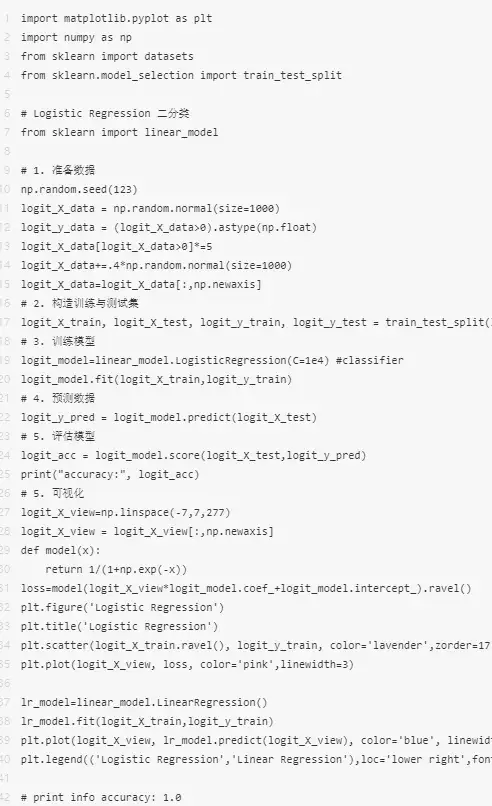 虽然写着回归,但实际上是一类二进行分类演算法。它将统计数据拟合到logit函数中,所以称为logit重回。简单来说就是基于一组给定的表达式,用logistic function来预估这个事件的机率,给出两个介于0和1之间的输入。具体基本原理参考:用人话讲明白逻辑重回Logistic regression – 化简可得的文章 – 知乎,下面给出代码的与此同时实现。