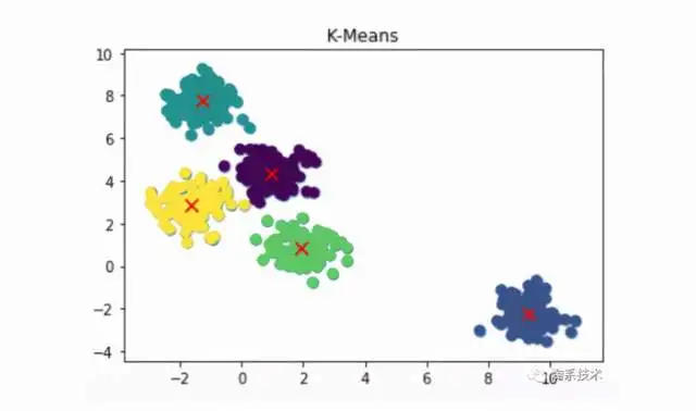# 1. 准备统计数据kmeans_X_data, kmeans_y_data = make_blobs(n_samples=500, centers=5, cluster_std=0.60, random_state=0)# 2. 体能训练数学模型kmeans_model = KMeans(n_clusters=5)kmeans_model.fit(kmeans_X_data)# 3. 预估数学模型kmeans_y_pred = kmeans_model.predict(kmeans_X_data)# 4. 可视化plt.figure(K-Means)plt.title(K-Means)plt.scatter(kmeans_X_data[:,0], kmeans_X_data[:, 1], s=50)plt.scatter(kmeans_X_data[:, 0], kmeans_X_data[:, 1], c=kmeans_y_pred, s=50, cmap=viridis)centers = kmeans_model.cluster_centers_plt.scatter(centers[:,0], centers[:, 1], c=red, s=80, marker=x)plt.show()