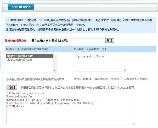 右侧选框中输出须要重定向到的搜索引擎,上面会表明聚合的301标识符,须要透过中文网站基本要素-文档管理工作-wwwroot下建立两个文档,重新命名.htaccess(若已近,只须要拷贝标识符加进进来),拷贝聚合的标识符黏贴到.htaccess中留存方可