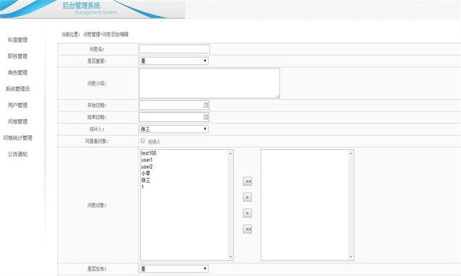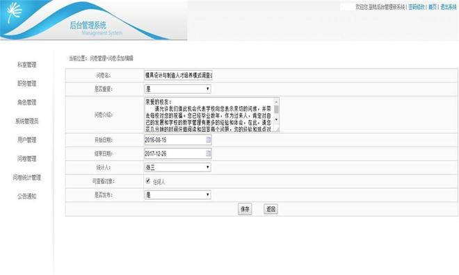 12.前台管理员要分权限,身份有超级管理员和统计员,超级管理员能对统计员设置管理不同类别问卷展开调查的权限,可设置多个超级管理员;