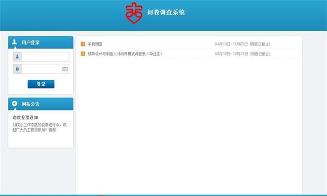 1.主页上表明问卷展开调查工程项目副标题(年份、多少天结束)、公告信息和登入框;