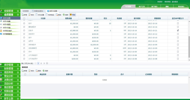 3、会员管理工作:会员卡增设、会员卡产品销售、会员卡管理工作、会员卡充值、会员卡维护、套餐管理工作等