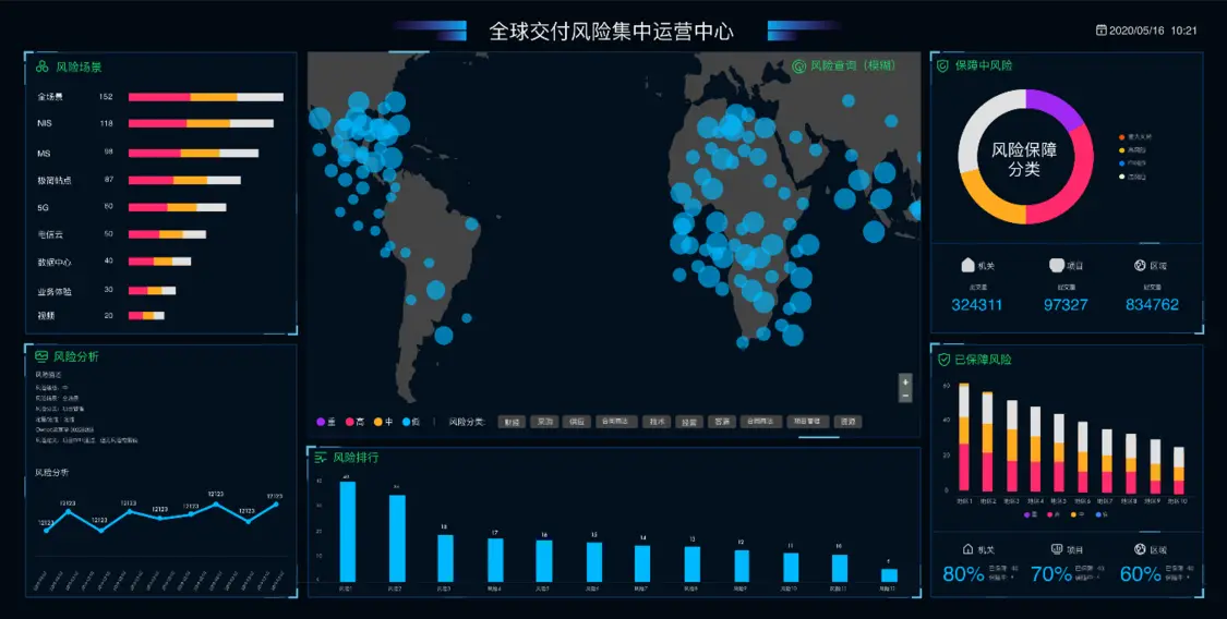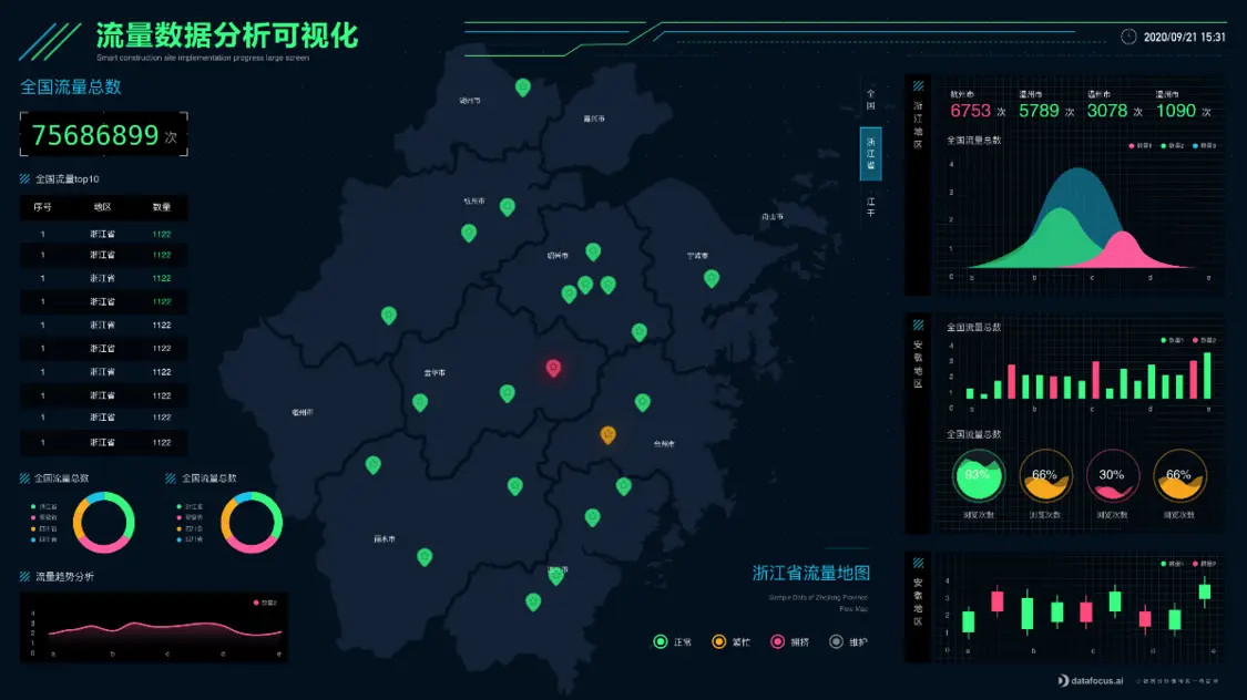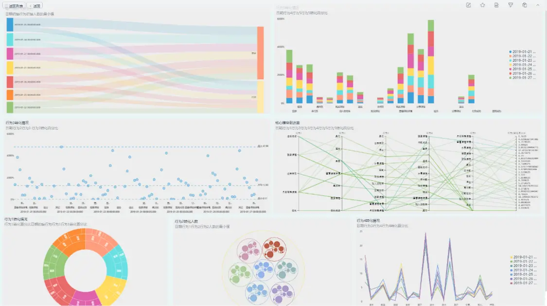 在DataFocus中制做一张可视化大屏只需要傻瓜式操作方式。DataFocus支持40多种可视化图象类型,包括柱状图、饼图、折线图、桑基图、时序图、弦图等。支持添加自定义文本框、背景、边框装饰、时间器、Tab控件等。还提供联动、跳转、上卷下钻、筛选等交互式分析能力,便于用户构建实时分析型数据看板,驱动业务决策。