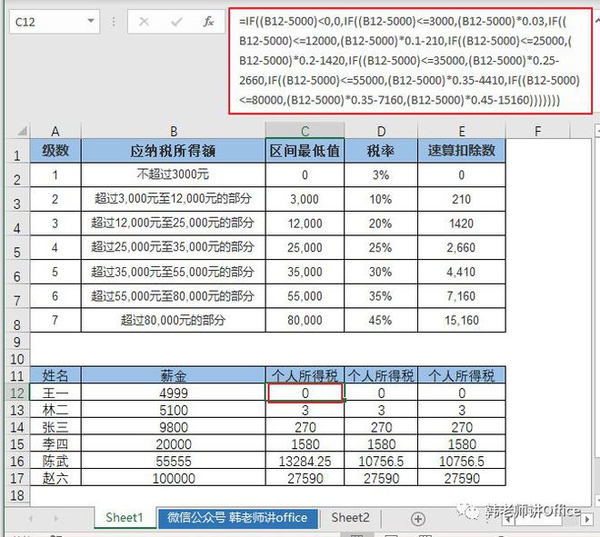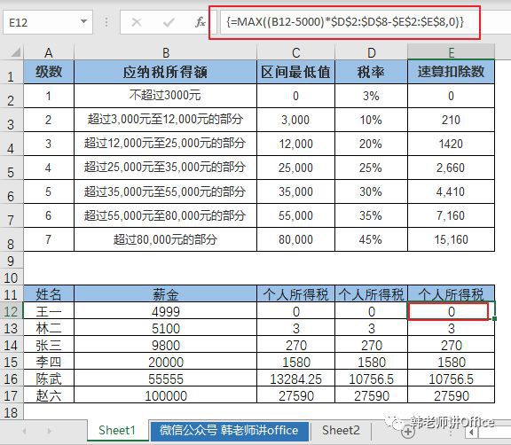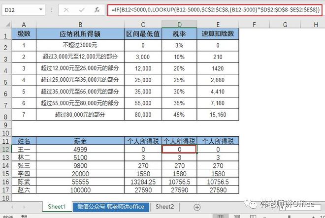 LOOKUP函数外套用IF函数,是考虑了薪水5000以下不纳税的情况、