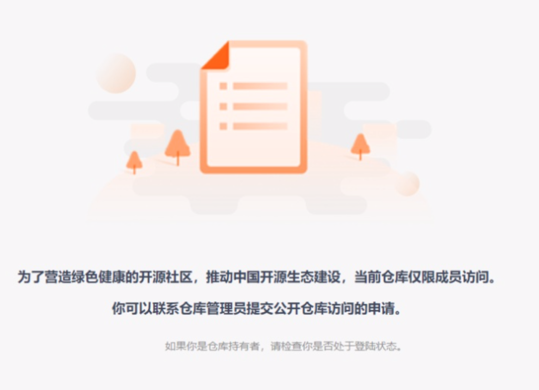 在 Gitee 上,许多 star 少的对外开放源码工程项目被停用了申明出访,但还可以查到,搜进来显示的是只限核心成员出访的网页。