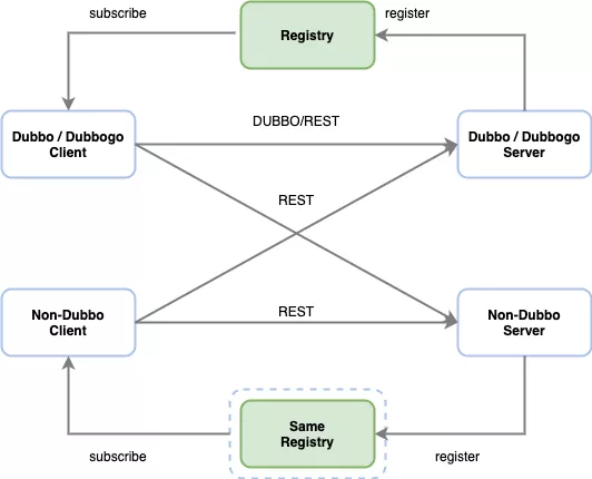 另外一个突出优点是,全力支持了 gRPC 和 REST之后,Dubbo-go 就可以考虑和一些公司内部自研的架构进行通信了。通常一些比较大的公司会自研架构,或者深度定制某些开放源码架构。而只要它们全力支持 gRPC 或者 HTTP 协定,Dubbo-go 就能保证与这些架构的无缝衔接。