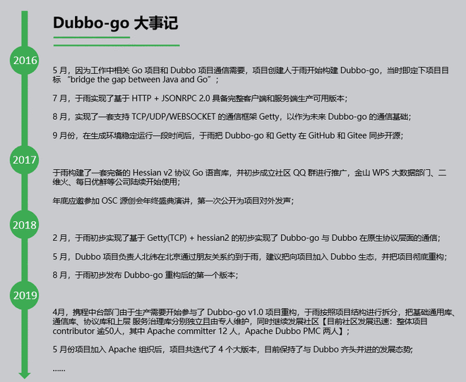 事实上,在 Dubbo-go 重新加入 Dubbo 非官方自然生态以后,早已产业发展了一年。它最先由其创办人于雨在2016年5月构筑,翌年9月正式发布并开放源码的。如下表所示本篇图明晰历史记录了 Dubbo-go 的今生今生。