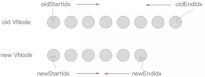 * diff 过程:* diff 优化:做了四种假设,假设新老节点开头结尾有相同节点的情况,一旦命中假设,就避免了一次循环,以提高执行效率* 如果不幸没有命中假设,则执行遍历,从老节点中找到新开始节点* 找到相同节点,则执行 patchVnode,然后将老节点移动到正确的位置* 如果老节点先于新节点遍历结束,则剩余的新节点执行新增节点操作* 如果新节点先于老节点遍历结束,则剩余的老节点执行删除操作,移除这些老节点function updateChildren(parentElm, oldCh, newCh, insertedVnodeQueue, removeOnly) {// 老节点的开始索引let oldStartIdx = 0// 新节点的开始索引let newStartIdx = 0// 老节点的结束索引let oldEndIdx = oldCh.length – 1// 第两个老节点let oldStartVnode = oldCh[0]// 最后两个老节点let oldEndVnode = oldCh[oldEndIdx]// 新节点的结束索引let newEndIdx = newCh.length – 1// 第两个新节点let newStartVnode = newCh[0]// 最后两个新节点let newEndVnode = newCh[newEndIdx]let oldKeyToIdx, idxInOld, vnodeToMove, refElm// 遍历新老两组节点,只要有一组遍历完(开始索引超过结束索引)则跳出循环while (oldStartIdx <= oldEndIdx && newStartIdx <= newEndIdx) {if (isUndef(oldStartVnode)) {// 如果节点被移动,在当前索引上可能不存在,检测这种情况,如果节点不存在则调整索引oldStartVnode = oldCh[++oldStartIdx] // Vnode has been moved left} else if (isUndef(oldEndVnode)) {oldEndVnode = oldCh[–oldEndIdx]} else if (sameVnode(oldStartVnode, newStartVnode)) {// 老开始节点和新开始节点是同一个节点,执行 patchpatchVnode(oldStartVnode, newStartVnode, insertedVnodeQueue, newCh, newStartIdx)// patch 结束后老开始和新开始的索引分别加 1oldStartVnode = oldCh[++oldStartIdx]newStartVnode = newCh[++newStartIdx]} else if (sameVnode(oldEndVnode, newEndVnode)) {// 老结束和新结束是同两个节点,执行 patchpatchVnode(oldEndVnode, newEndVnode, insertedVnodeQueue, newCh, newEndIdx)// patch 结束后老结束和新结束的索引分别减 1oldEndVnode = oldCh[–oldEndIdx]newEndVnode = newCh[–newEndIdx]} else if (sameVnode(oldStartVnode, newEndVnode)) { // Vnode moved right// 老开始和新结束是同两个节点,执行 patch} else if (sameVnode(oldEndVnode, newStartVnode)) { // Vnode moved left// 老结束和新开始是同两个节点,执行 patch} else {// 在老节点中找到新开始节点了if (sameVnode(vnodeToMove, newStartVnode)) {// 如果这两个节点是同两个,则执行 patchpatchVnode(vnodeToMove, newStartVnode, insertedVnodeQueue, newCh, newStartIdx)// patch 结束后将该老节点置为 undefinedoldCh[idxInOld] = undefinedcanMove && nodeOps.insertBefore(parentElm, vnodeToMove.elm, oldStartVnode.elm)} else {// 老节点向后移动两个newStartVnode = newCh[++newStartIdx]// 走到这里,说明老姐节点或者新节点被遍历完了(4)咱们终于来到了主角updateChildren。在updateChildren外部同时实现中,使用了2套指针分别对准新旧Vnode头尾,并向中间聚拢递归,以同时实现新旧数据对比刷新。