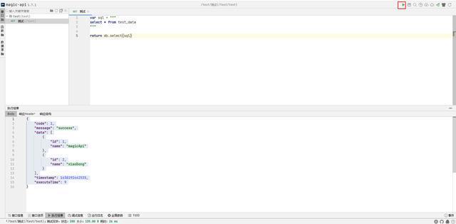 > curl http://localhost:9999/test/test { “code”: 1, “message”: “success”, “data”: [ { “id”: 1, “name”: “magicApi” }, { “id”: 2, “name”: “xiaoDong” } ], “timestamp”: 1638192442535, “executeTime”: 9 }
