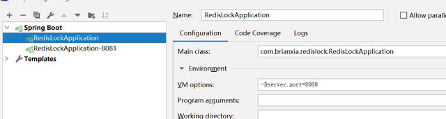 在IDEA中配置两个spring boot的开启项,采用vm参数指定不同的端口号