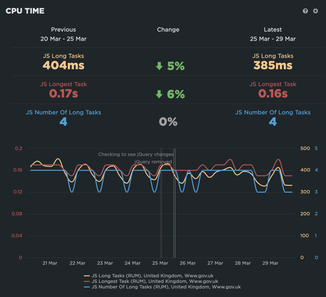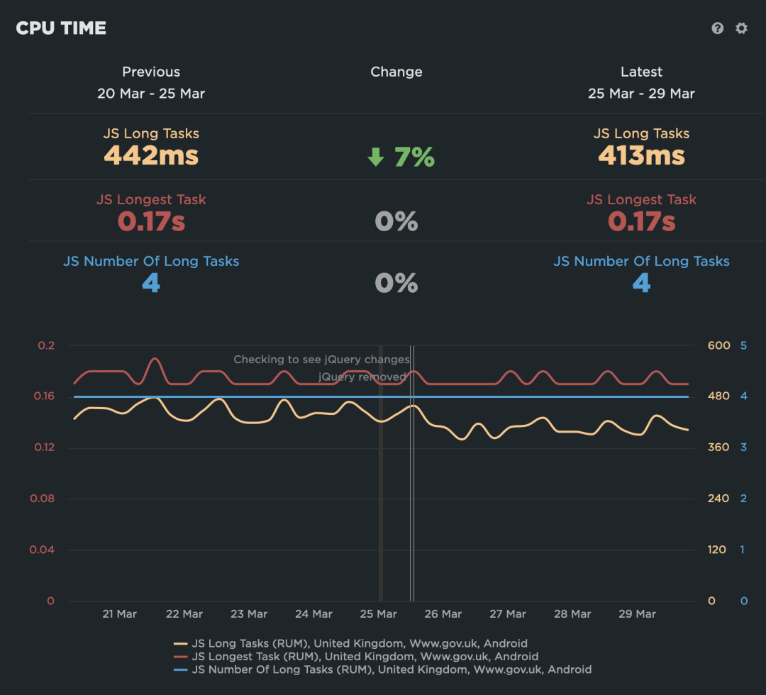 在 75% 的网页中仅检查 Android 使用者,能看见 JS 长各项任务改良了 7%:
